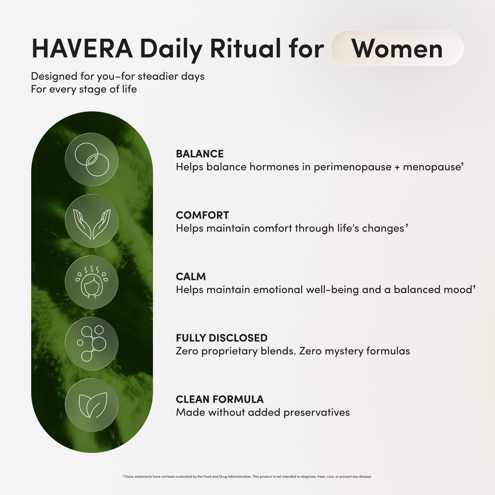 HAVERA provides full-spectrum botanical support for steadier days, cooling comfort, and calm balance through life’s changes.*